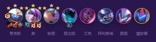 1、阵容搭配:贾克斯+蔚+锐雯+瑟庄妮+艾克+阿利斯塔+瑟提+蕾欧娜