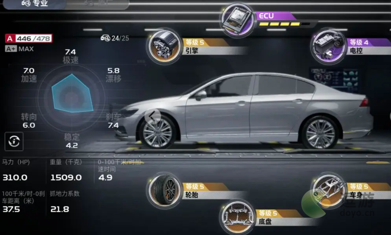 3、在车的改装上面将轮胎,电控其中一个改为转弯漂移的稳定性属性,剩下的都是极速属性。